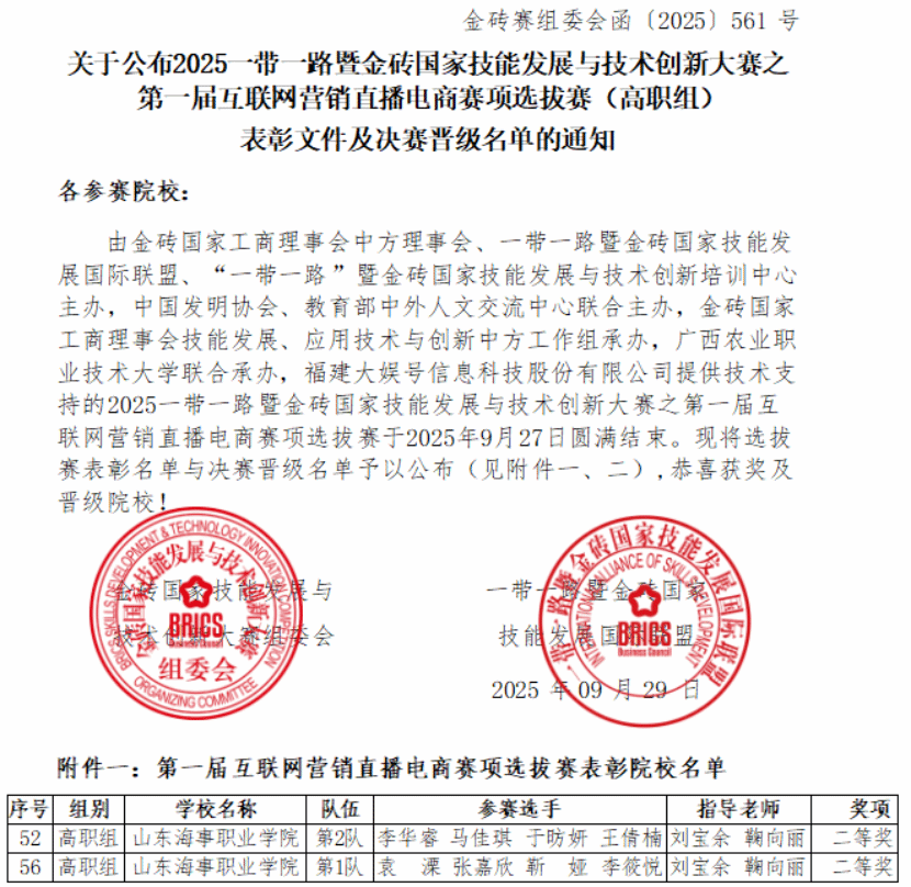 近日,2025一带一路暨金砖国家技能发展与技术创新大赛互联网营销直播电商赛项圆满落幕,我校电商专业李华睿、王倩楠、于昉妍、马佳琪团队和袁溧、张嘉欣、靳娅、李筱悦团队在刘宝余、鞠向丽两位老师指导下均获二等奖,其中李华睿、王倩楠、于昉妍、马佳琪晋级国赛。