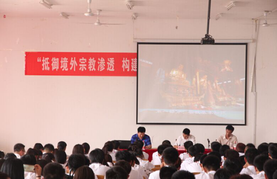 王国臣大队长就新时期高校大学生的意识形态,从如何正确看待民族宗教问题、境外敌对势力利用宗教进行渗透的实质、当前高校抵御境外宗教渗透面临的形势及境外宗教在高校的渗透途径等方面,通过列举大量实例使全体师生从思想深处对境外宗教渗透和邪教问题有了一个质的认识,提高了防范意识。最后王国臣大队长对全院师生提出了希望,希望高校师生统一思想,提高认识,崇尚科学,远离宗教和邪教做现代文明的追求者,实践者和传播者。