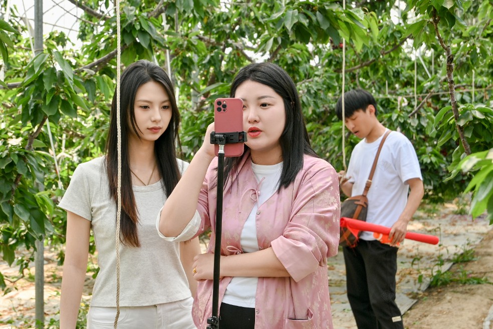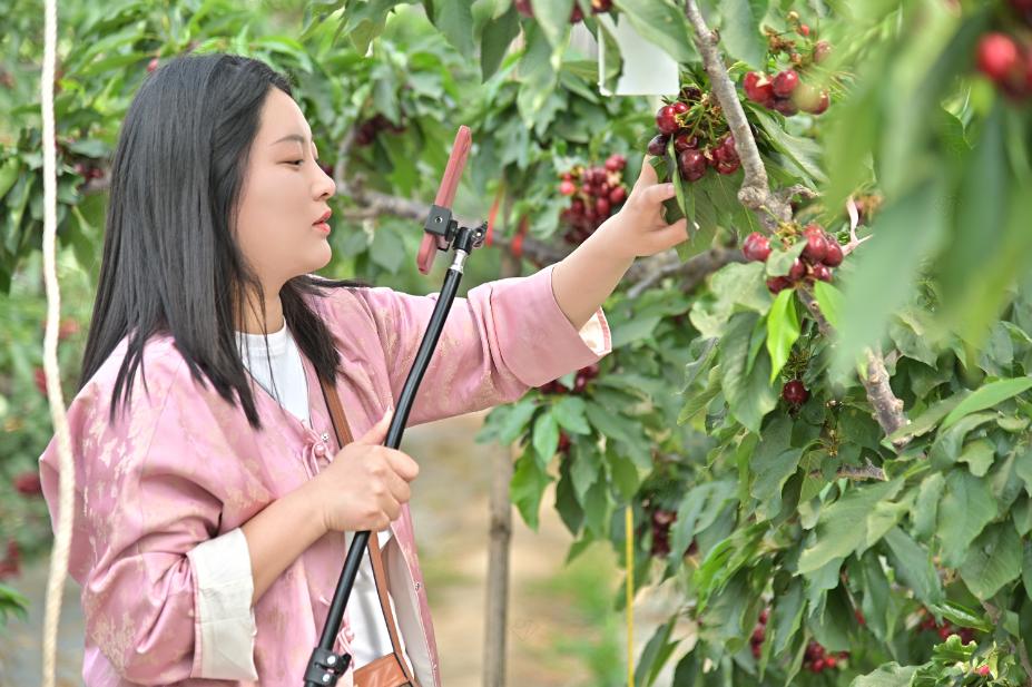 活动现场,埠口村樱桃基地内千亩果园硕果盈枝,红彤彤的樱桃挂满枝头,丰收景象令人振奋。电商学院直播团队成员深入果园,通过镜头多角度记录樱桃生长环境、采摘过程及果实品质,以短视频、直播等形式向全网展示樱桃的天然生态优势。