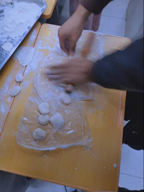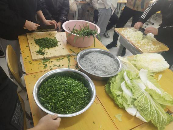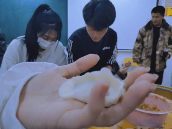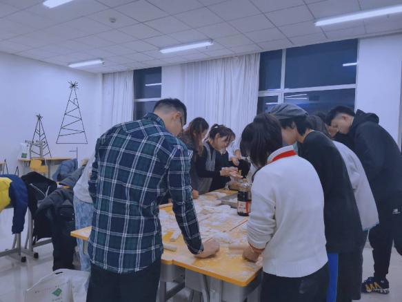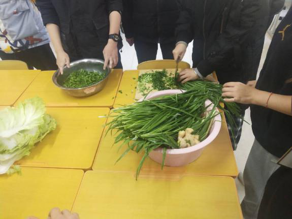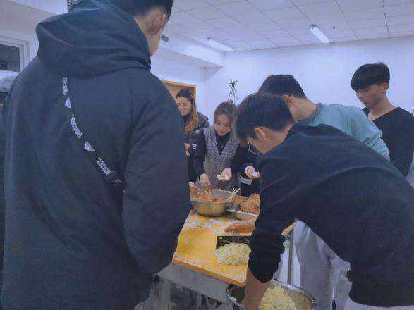 准备就绪后,各班学生以班为单位开始忙碌,分工后大家迫不及待地挽起了衣袖准备大干起来,窗外寒意袭人,屋内却是热闹非凡、欢声笑语,学长学姐也捋起袖子加入到包饺子的强大阵营当中!