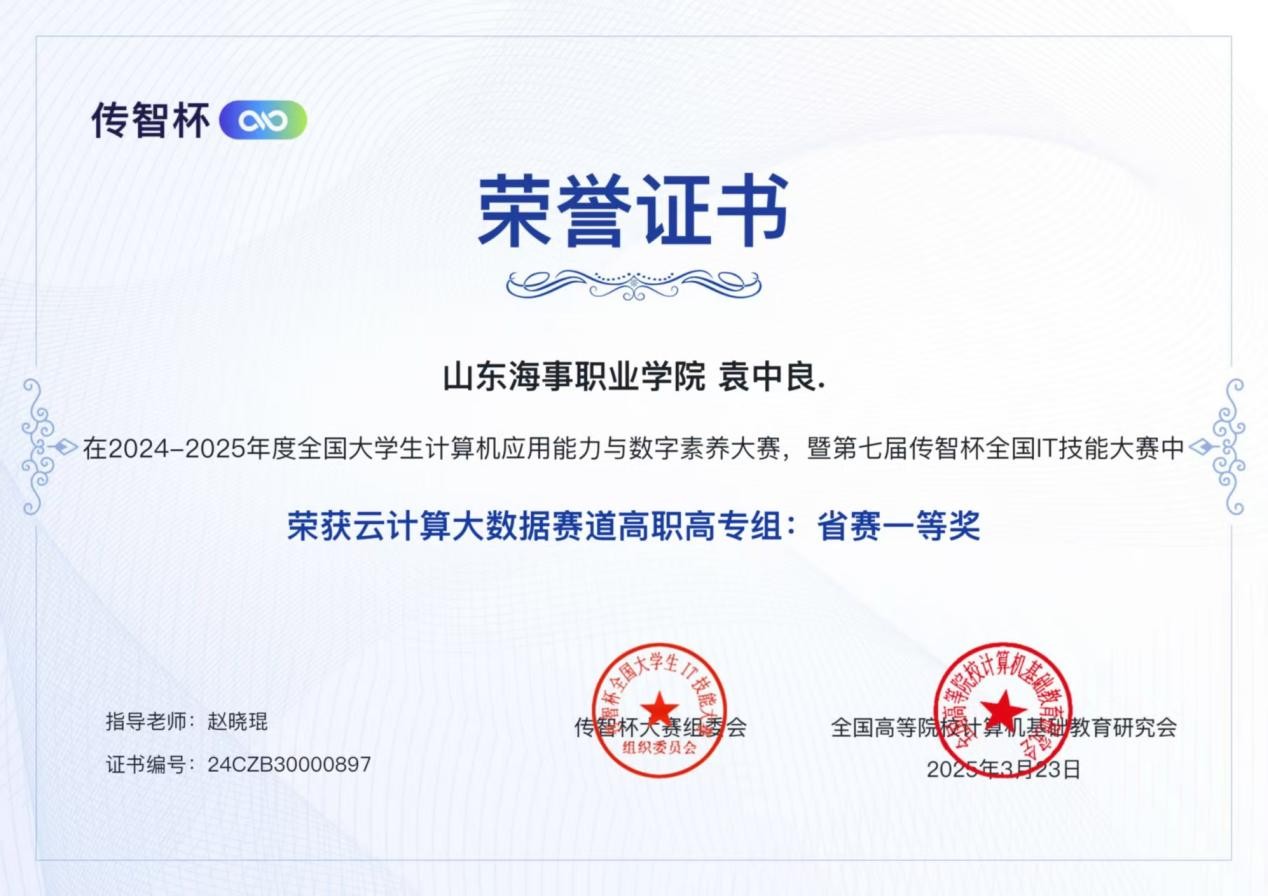 近日,由全国高等院校计算机基础教育研究会主办的2025年第七届“传智杯”全国大学生计算机大赛省赛圆满落幕。电商学院学子袁中良在云计算大数据赛项中经过激烈的算法、数据处理与分析等模块比拼,从1400多所高校参赛队伍中脱颖而出,最终斩获省赛一等奖,顺利进入国赛。充分展现了电商学院学子扎实的专业功底和技术创新应用能力,指导老师赵晓琨荣获优秀指导教师,为学校赢得了荣誉。