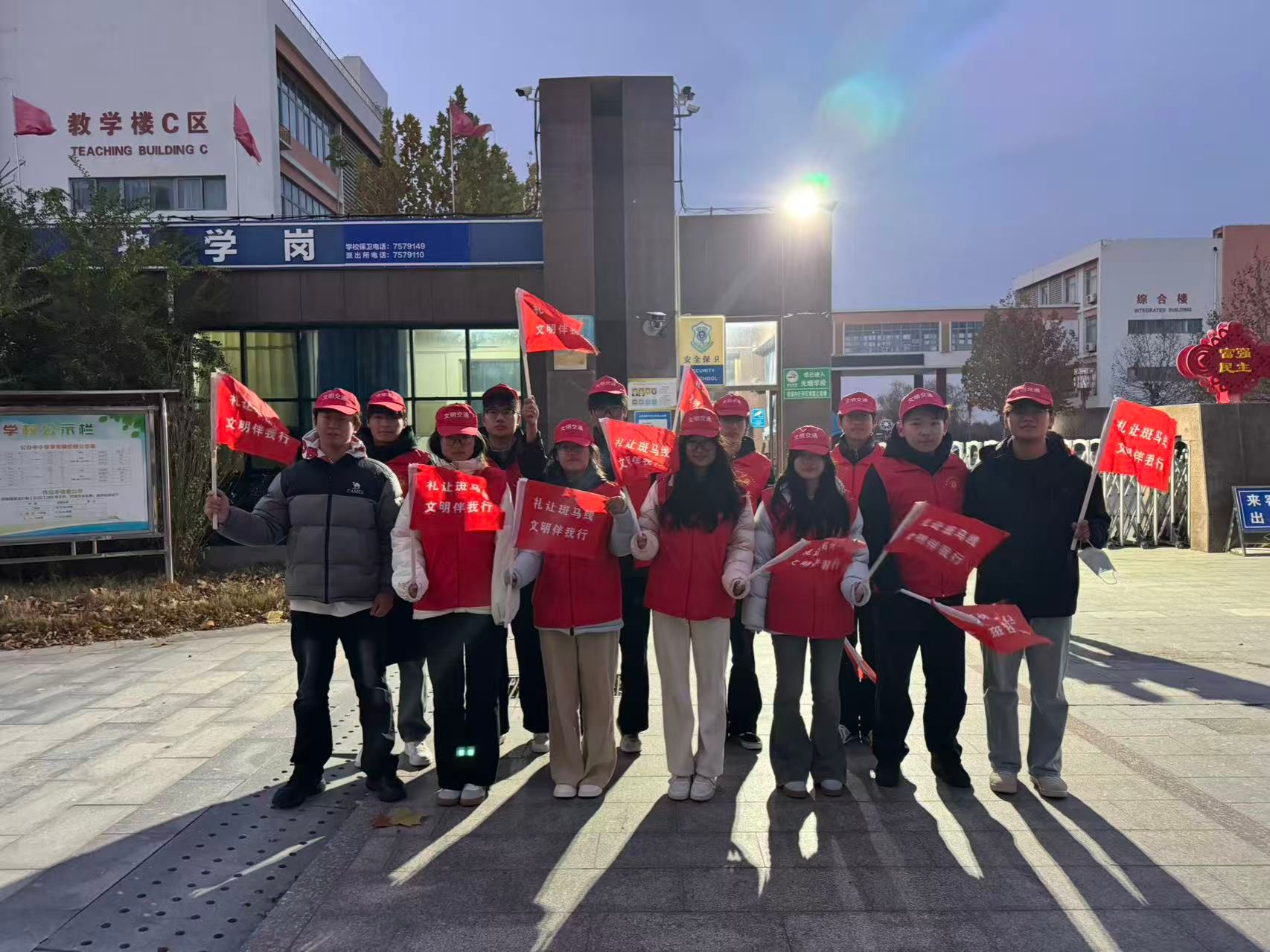 11月17日,为优化道路交通环境,筑牢校园周边安全防线,助力城市文明品质提升,山东海事职业学院电商学院红心志愿服务队的13名志愿者,在潍坊蓝海学校门口护学岗开展“畅行潍坊・礼让斑马线”志愿服务活动。此次活动由潍坊市社会工作部、潍坊市志愿服务联合会指导,联合滨海爱心义工公益服务共同举办。